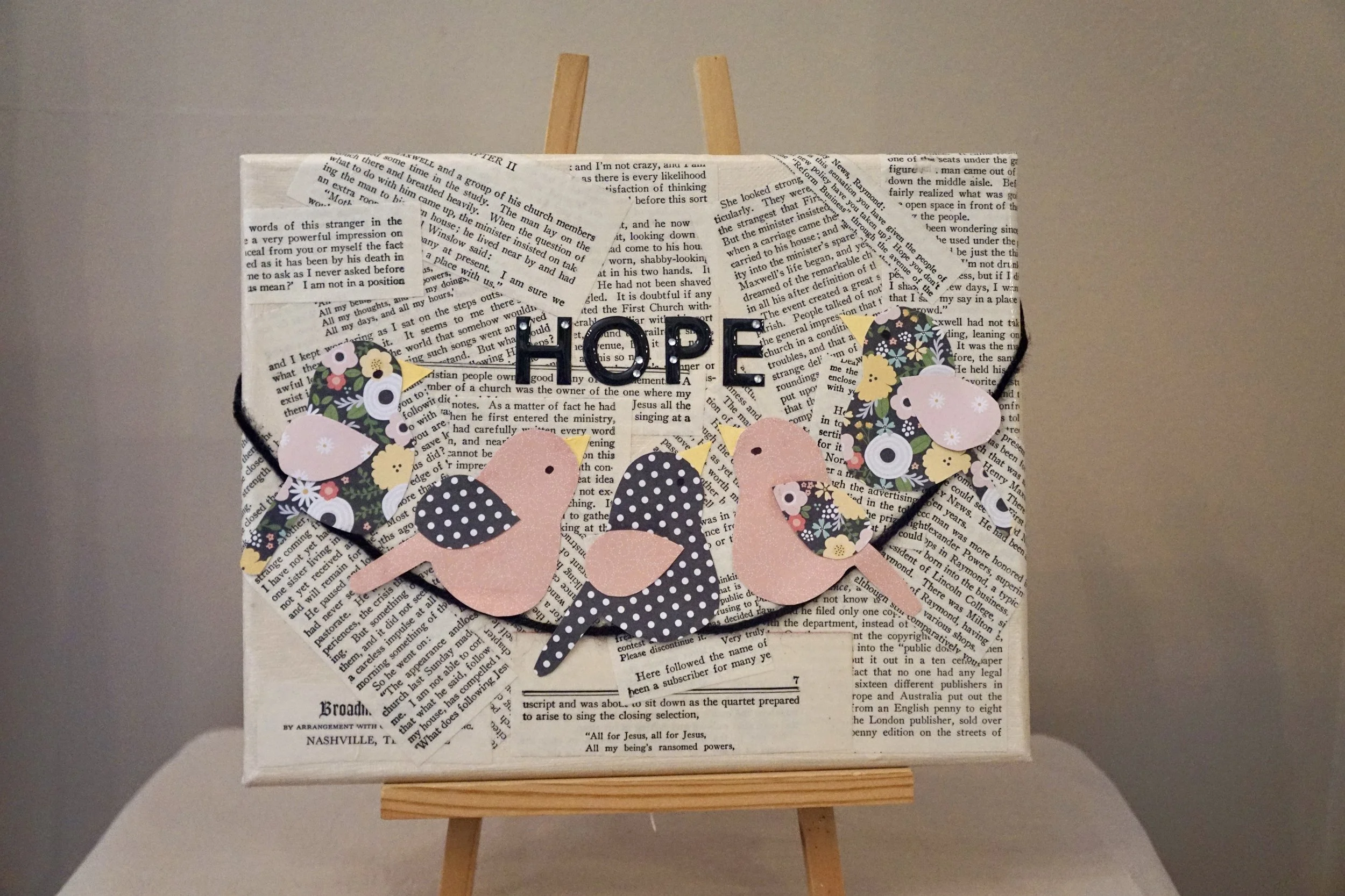 We will make an 8 X 10 canvas with a background of words, newspaper headlines or magazine clippings to depict the many things that are going on in the world. We will add birds on a wire with the word Hope. We will spend time in scripture with verses of God’s promises of Hope and how God takes care of the birds and us. We will discern God’s voice personally in the areas of our lives where we need hope. Each bird will be created with colors and patterns of our choice.